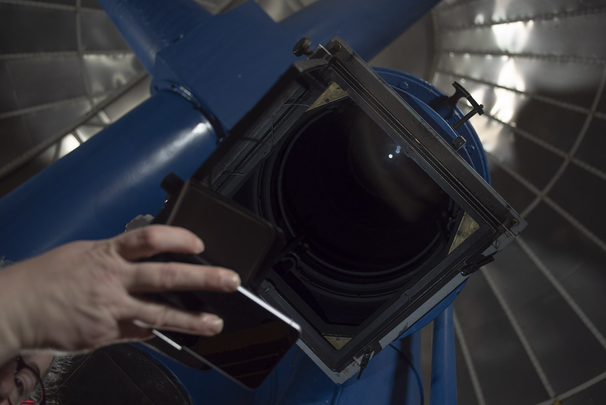 Nur bei entsprechender Beleuchtung sind die Dimensionen der beiden dreilinsigen Astro-Objektive und der Plattenhalterung zu erkennen.