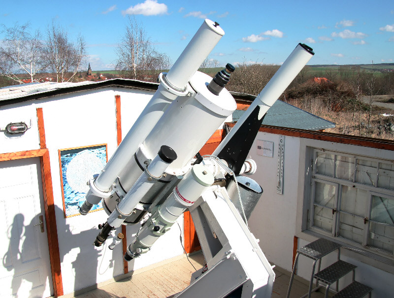 130/1000 mm (unten), ein FH-Refraktor 80/1200 mm (links unten) und, auf
