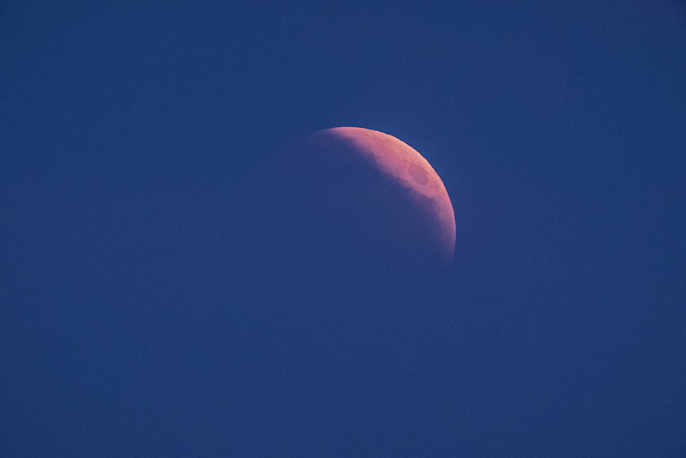 Dieses Bild entstand wenige Minuten nachdem sich die schon schmale verfinsterte Mond durch den Horizontdunst hindurchgekämpft hatte.